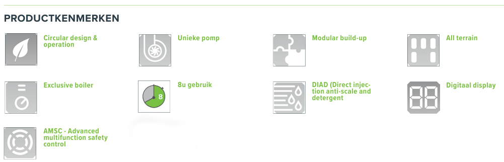 - Opbergruimte voor pistool, lans, slang, nozzles en kleine toebehoren.